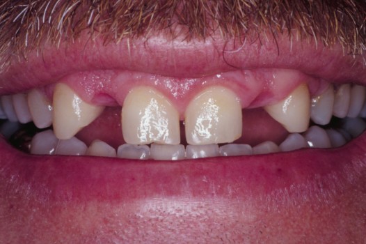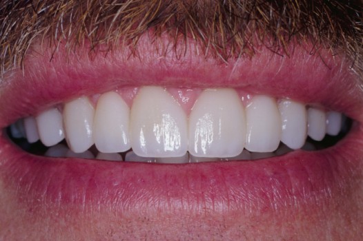 We decided to take a conservative approach and go back to orthodontics, moving his teeth back so he could have the advantage of eye teeth for the first time in his life. The photo above shows how we opened up spaces to accommodate a double bridge. (Another option easily applicable here would have been to place two implants.) This process allowed Andy’s smile a broader arch, showing more teeth in his smile, which always opens up the face. I did a gum lift with the laser followed by the placement of non-metal dental bridgesand ceramic veneers on the remaining upper ten front teeth.