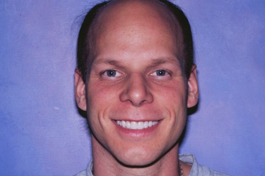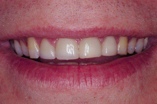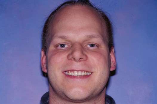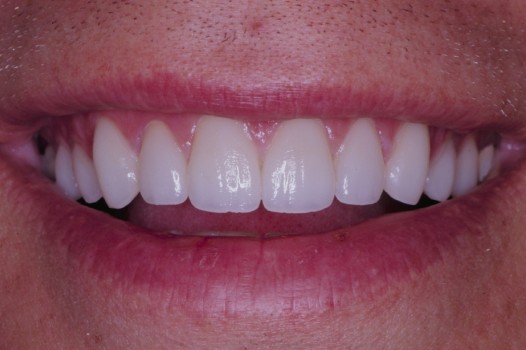 I set out to re-sculpt his gum line and followed with ten ceramic veneers on the upper ten front teeth. I took special note to lengthen and align the front teeth to harmonize with his facial features. This smile makeover was accomplished in two visits.