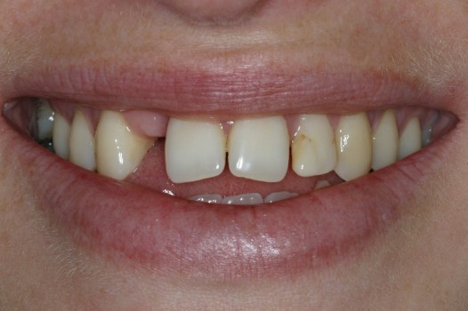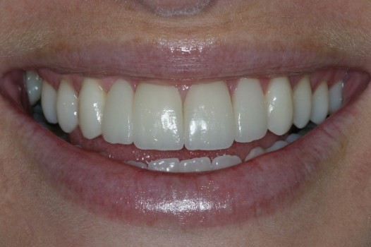 In Wendy’s case I decided to lengthen the two front teeth so to align them with the rest of her smile plane. Veneers were designed for the right central and lateral, and a non-metal bridge, using the same ceramic as the veneers was designed to replace the missing tooth and veneer the right central. As you see with the before and after photos, Wendy’s dramatic smile makeover was accomplished by enhancing just four teeth.